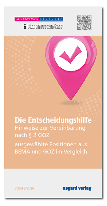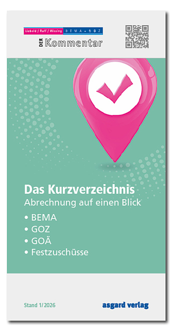 Das neu zusammengestellte Kurzverzeichnis mit allen Positionen aus BEMA und GOZ, den wichtigsten Positionen aus der GOÄ und den Befundklassen bei den Festzuschüssen. Damit haben Sie die Grundlagen der Abrechnung immer schnell zur Hand.